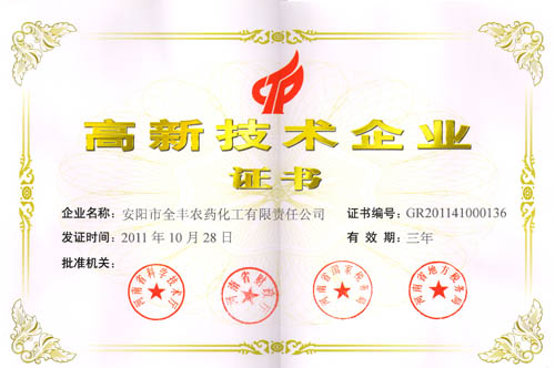 2011年10月,安陽全豐生物科技有限公司被河南省科學(xué)技術(shù)廳、河南省財(cái)政廳、河南省國(guó)家稅務(wù)局、河南省地方稅務(wù)局聯(lián)合評(píng)定為“河南省高新技術(shù)企業(yè)”。