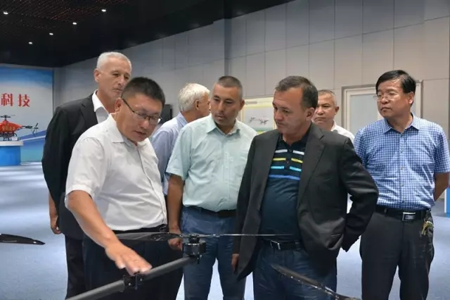 考察團(tuán)一行在全豐航空董事長(zhǎng)王志國(guó)的陪同下,首先參觀了無(wú)人機(jī)展廳。當(dāng)王總介紹3WQF120-12型油動(dòng)單旋翼植保無(wú)人機(jī)時(shí),塔沙耶夫和隨行專(zhuān)家詳細(xì)詢問(wèn)了該款機(jī)型的載重及續(xù)航能力,每天的作業(yè)量有多少,一天能夠起飛多少個(gè)架次,邊聽(tīng)介紹邊讓工作人員詳細(xì)記錄下來(lái)。